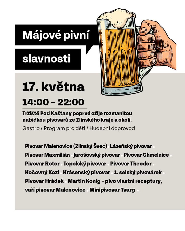 Tržiště Pod Kaštany se tak na jeden den stane centrem pivního veselí a dobré zábavy. Všichni, kteří mají rádi poctivé řemeslné pivo a chtějí strávit příjemnou sobotní odpoledne a večer, jsou srdečně zváni na první ročník Májových pivních slavností ve Zlíně.