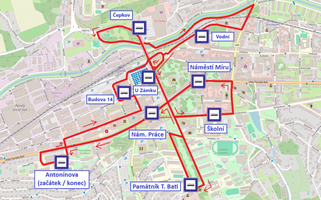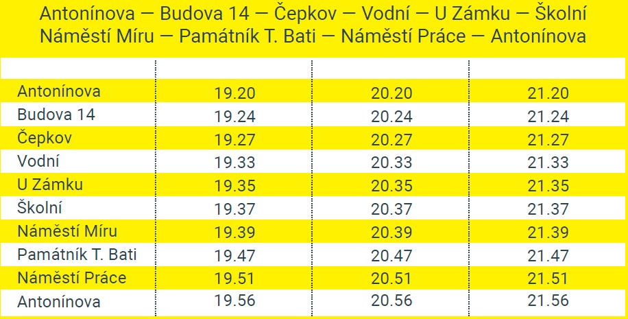 Zrekonstruovaný autobus vyjede z točny trolejbusů Antonínova hned třikrát během večera – v 19:20, 20:20 a 21:20 hodin. Na své trase obslouží důležitá místa programu, jako je kulturní zóna 14|15 Baťova institutu, centrum města či Památník Tomáše Bati.