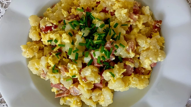 Na pánvi rozehřejte máslo nebo olej. Přidejte šalotky a opékejte je dozlatova a do změknutí. Přidejte hotové halušky na pánev k šalotkám. Rozklepněte vejce přímo k haluškám a míchejte, dokud se vejce nesrazí a neobalí halušky.