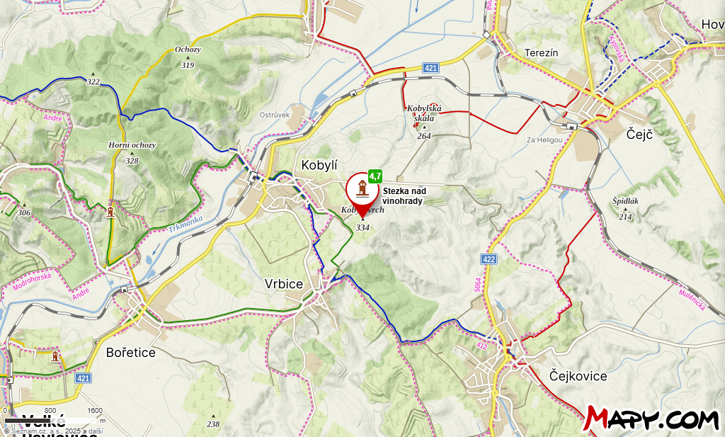 Z centra obce Kobylí vás čeká asi 1,5 km po naučné stezce mezi vinicemi. Parkoviště je cca 500 m pod rozhlednou. Dá se sem dostat pěšky, na kole i veřejnou dopravou (vlak + chůze).