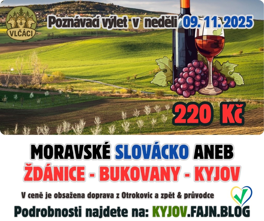 VLČÁCI | V neděli 9. listopadu 2025 se vydáme na poznávací výlet po Moravském Slovácku 🌞. Trasa povede ze Ždánic přes Bukovany do Kyjova a ukáže, jak se kraj mění od lesů po vinohrady 🍷. Cílem je pohodový den plný výhledů, vína, tradic a přátelské nálady.