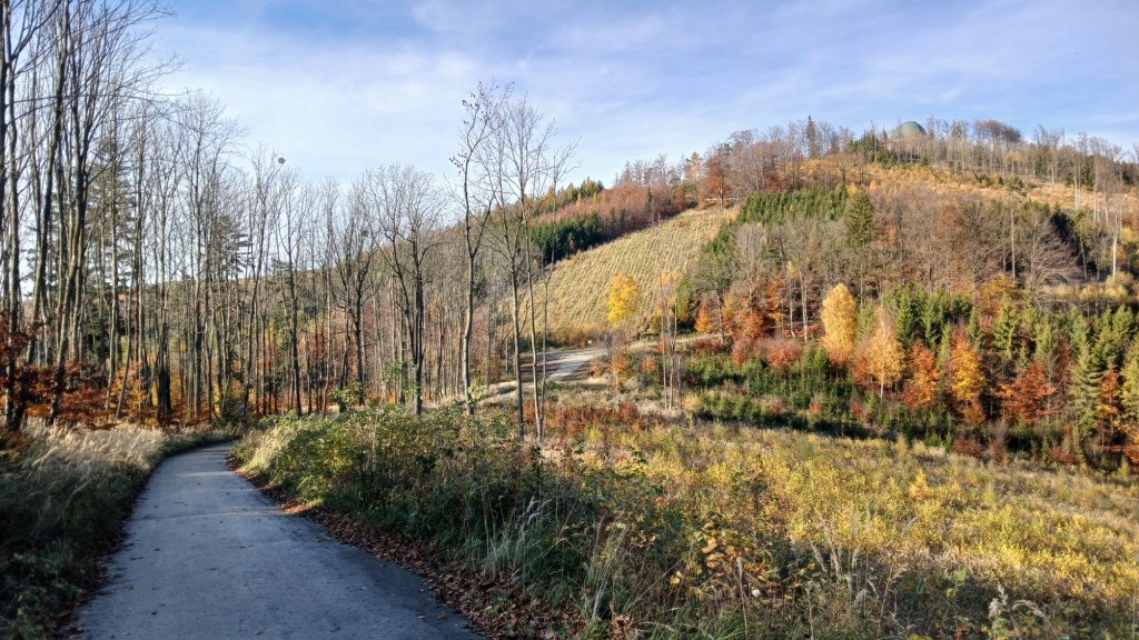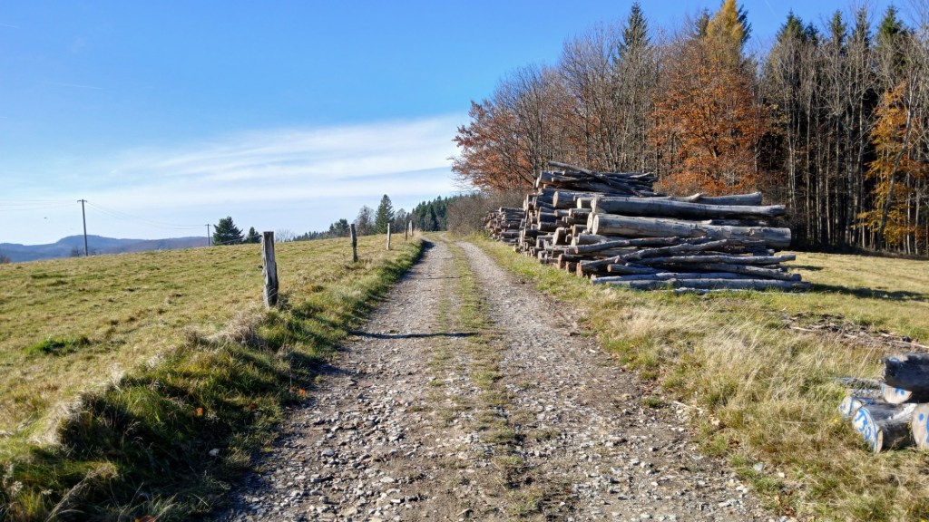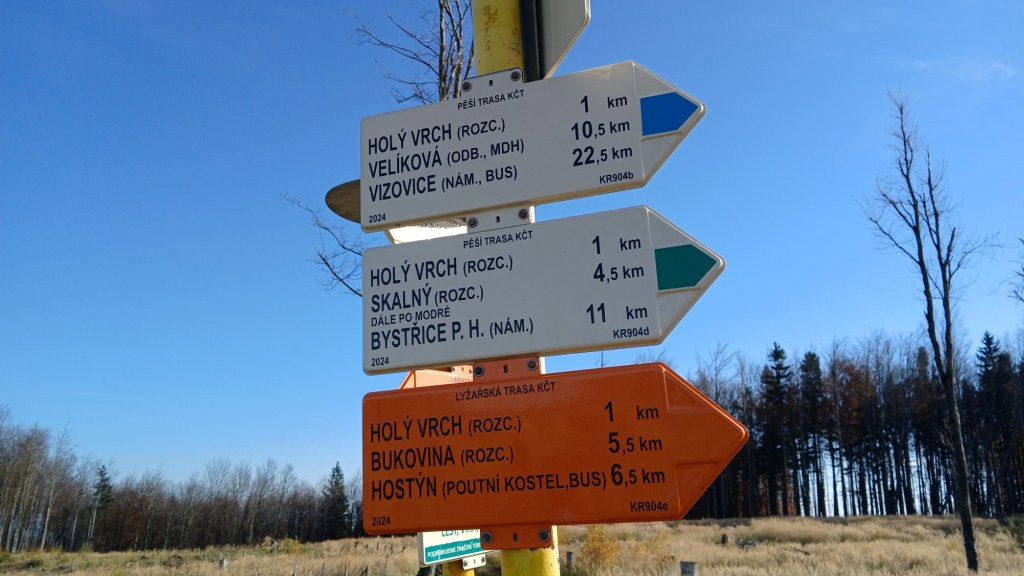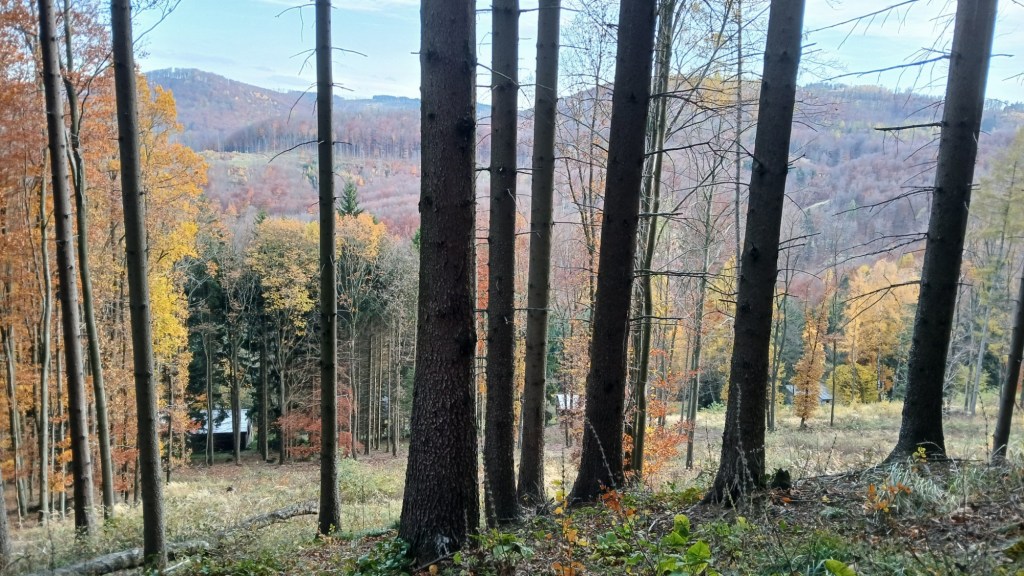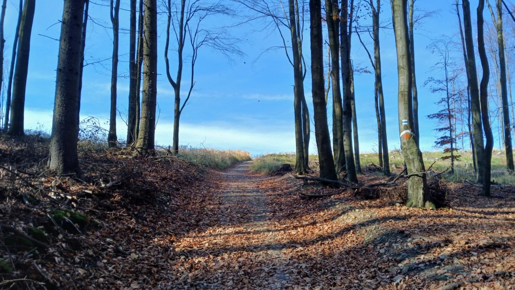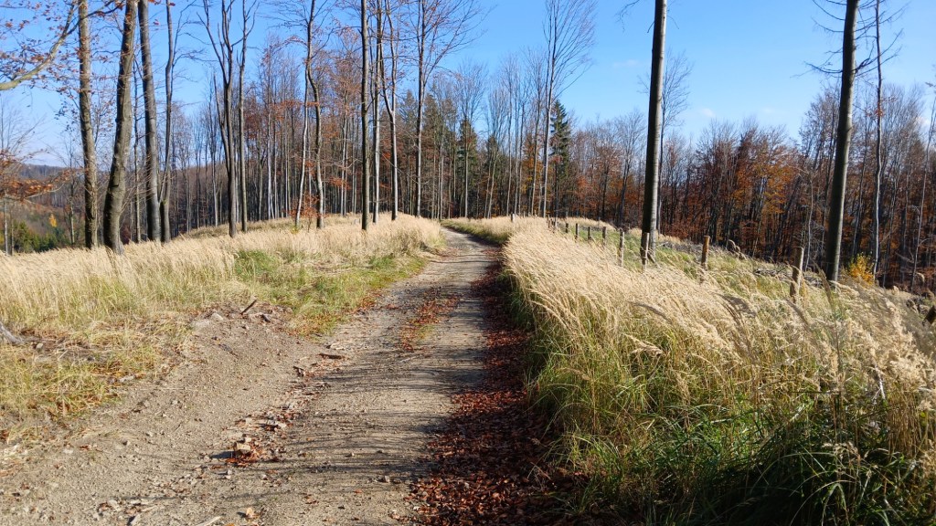 Za odbočkou od Tesáku se trasa napojila na jižní hřeben a držela směr ke Skalnému (709 m). Les se tu otevřel do světlin a občas bylo vidět dolů k Rusavě i na vzdálené Vizovické vrchy. Mezi buky se střídaly úseky kamenných výchozů a měkkého jehličí, po kterém se šlo tiše. Za Skalným následoval pozvolný výstup na Bukovinu (729 m), kde se hřeben zvedl naposledy před Hostýnem. Vzduch byl vlhký, v mechu se zrcadlily kapky a kolem panoval ten známý hostýnský klid. 🍃