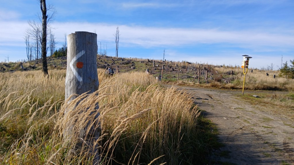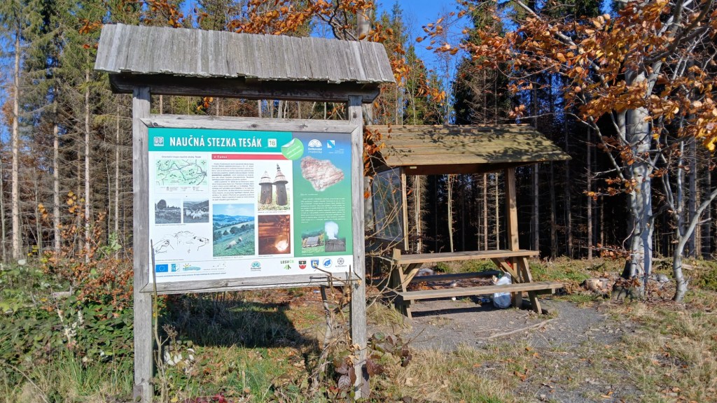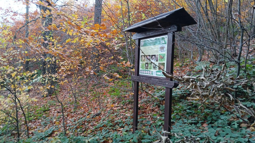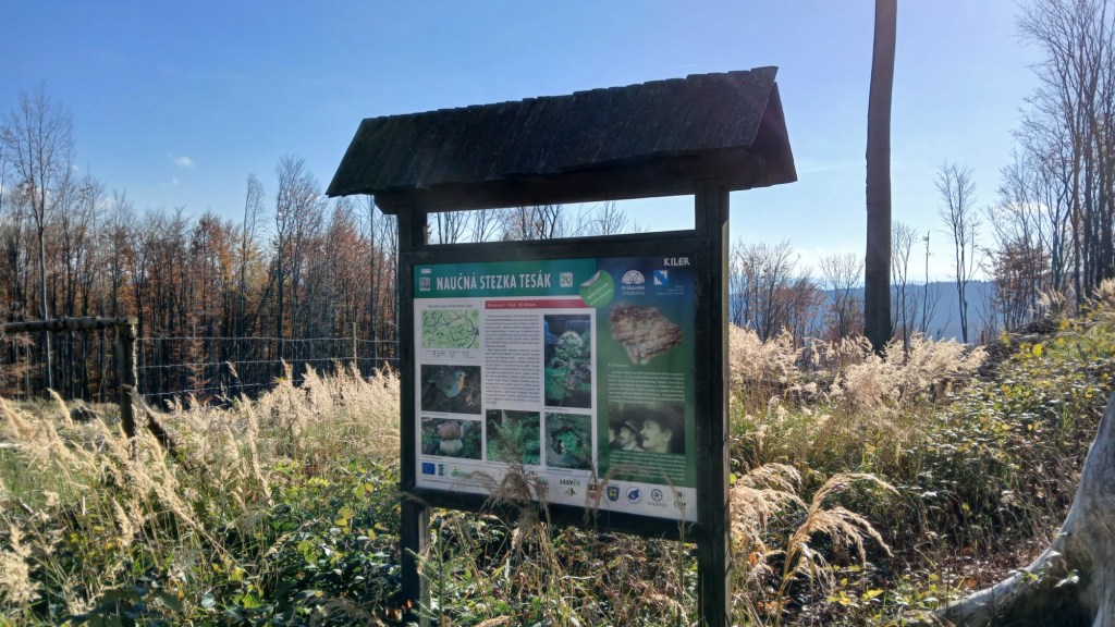 K sedlu Tesák (690 m) jsme nedošli, trasa ho minula pod hřebenem a držela se klidnější linie. Okraje přírodní rezervace Tesák byly znát na struktuře porostu: staré bukové kmeny, mech a vlhké trámy přes drobné toky. Po cestě se objevilo značení cyklotrasy 5035 na kmíncích a kamenech, ale provoz byl minimální. Krátký vývěr vody v mechu potvrdil, že tohle je správné místo na doplnění dechu. 💧