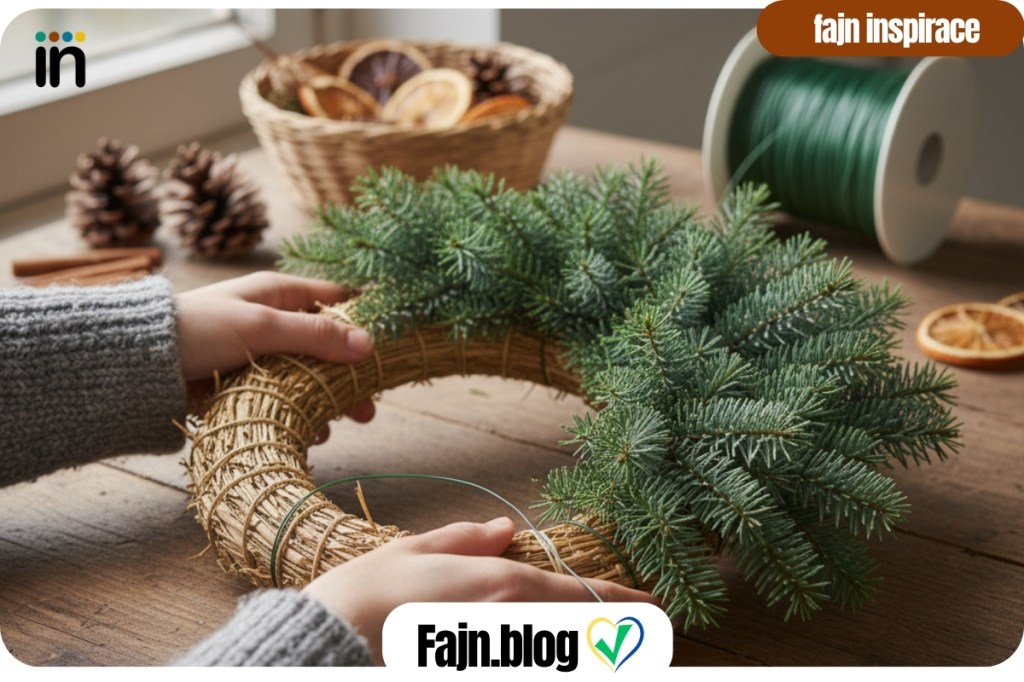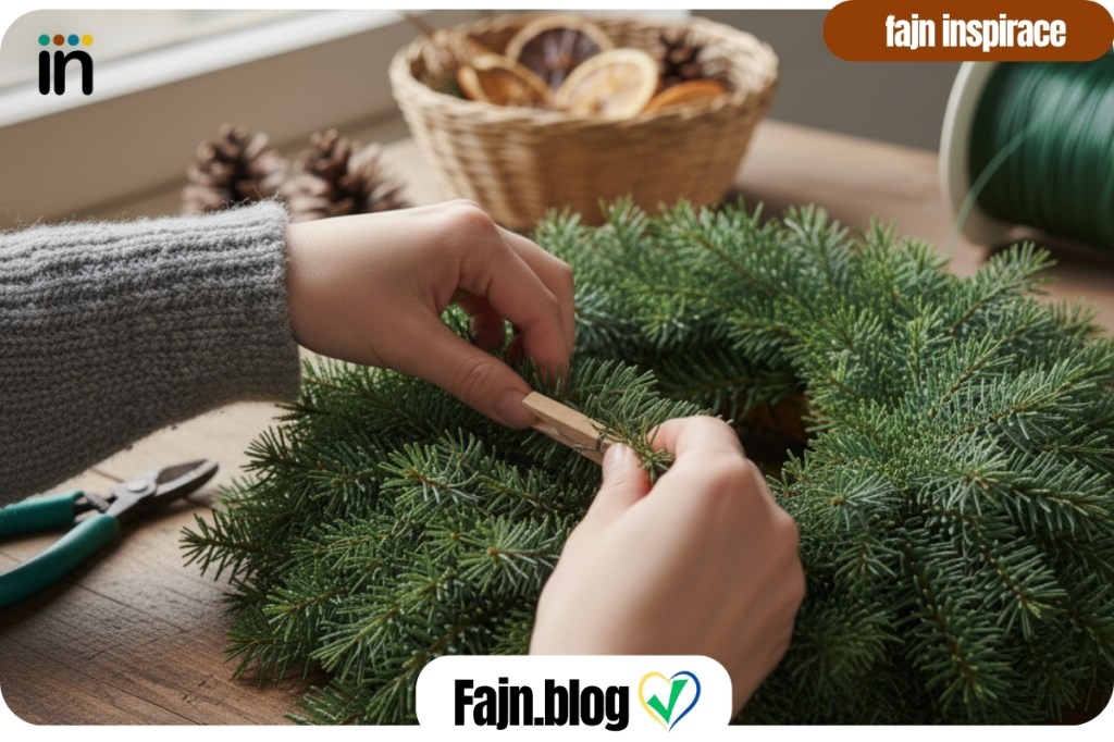 Nejobtížnější částí celého procesu je bezesporu nenápadné napojení konce věnce na jeho začátek. 🔗 Když se s vázáním blížíte k prvním větvičkám, musíte poslední řady opatrně podsunout pod ty úplně první. 🌲 Zde si můžete pomoci tím, že si první řadu přizvednete kolíčkem nebo ji přidržíte druhou rukou. ✋ Cílem je vytvořit dokonalý optický klam, kde nikdo nepozná, v kterém místě jste s prací začali a kde jste skončili.
