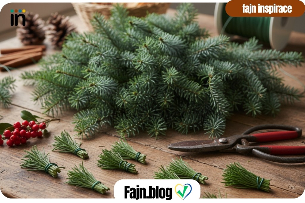 Než začnete omotávat drát, musíte si všechen rostlinný materiál pečlivě nastříhat na menší, stejně dlouhé kousky. 📏 Ideální délka jednotlivých větviček se pohybuje zhruba mezi deseti a dvanácti centimetry. 🌿 Příliš dlouhé větve by trčely a kazily kompaktní tvar, zatímco s příliš krátkými by práce postupovala velmi pomalu. ⏱️ Nastříhané chvojí si rovnou roztřiďte na hromádky podle kvality, abyste měli ty nejhezčí kousky připravené na viditelnou horní stranu.