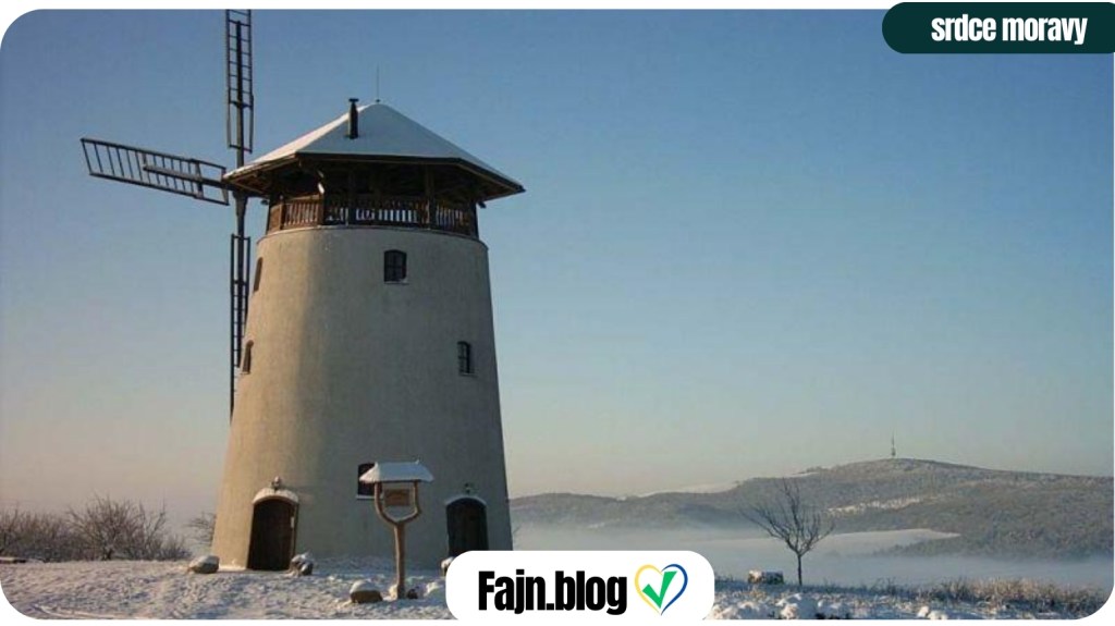 Jedna z nejatraktivnějších staveb na Slovácku, imitace historického větrného mlýna holandského typu, stojí v okrese Hodonín nedaleko Kyjova 🍷. Rozhledna je součástí areálu Bukovanského mlýna a je celoročně přístupná, ačkoliv v zimě může mít zkrácené provozní hodiny. Návštěvu můžete spojit s obědem či kávou v přilehlém hotelu, což je v chladném počasí příjemný bonus ☕. Výhled shora je nádherný, zahrnuje úrodnou Hanou, Ždánický les a za jasných dnů i siluety Pálavy na jihu Moravy ⛰️. Je to ideální cíl pro ty, kteří hledají kombinaci architektonického zážitku a pohledu do vinařského kraje.