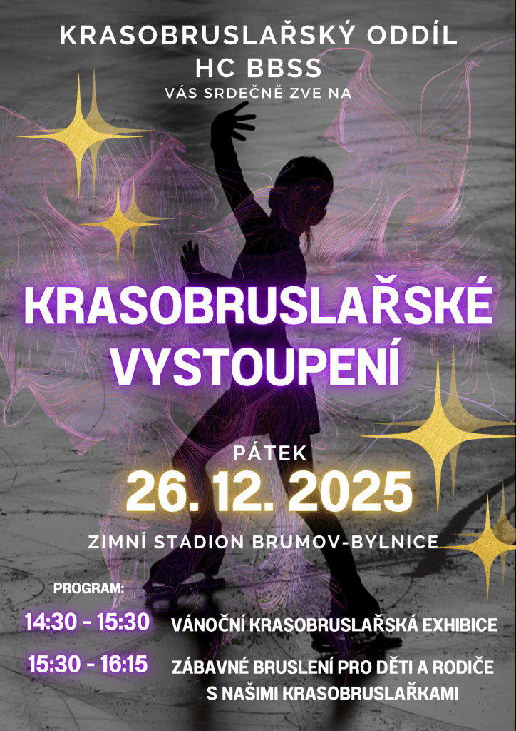 Sváteční program ve městě nekončí ani po Vánocích, protože v pátek 26. prosince 2025 se uskuteční velkolepé Krasobruslařské vystoupení v prostorách, které nabízí místní Zimní stadion, jenž poskytuje perfektní zázemí pro všechny milovníky ledových sportů. Talentovaní členové oddílu Krasobruslařský oddíl HC BBSS si pro diváky pečlivě nacvičili dechberoucí exhibici, která začíná ve 14:30 hodin a slibuje úžasnou podívanou plnou ladných pohybů, náročných skoků a elegantních piruet na ledové ploše.