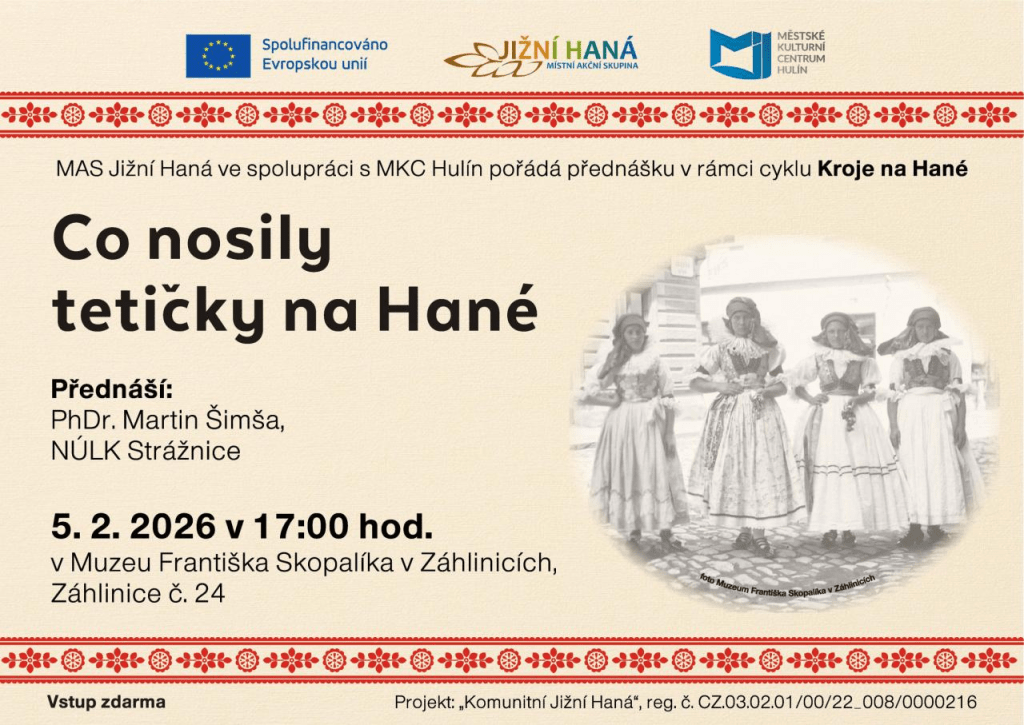 Veřejná prezentace s názvem „Co nosily tetičky na Hané“ se uskuteční ve čtvrtek 5. února 2026. Začátek programu je naplánován přesně na 17:00 hodin v prostorách budovy na adrese Záhlinice č. 24.