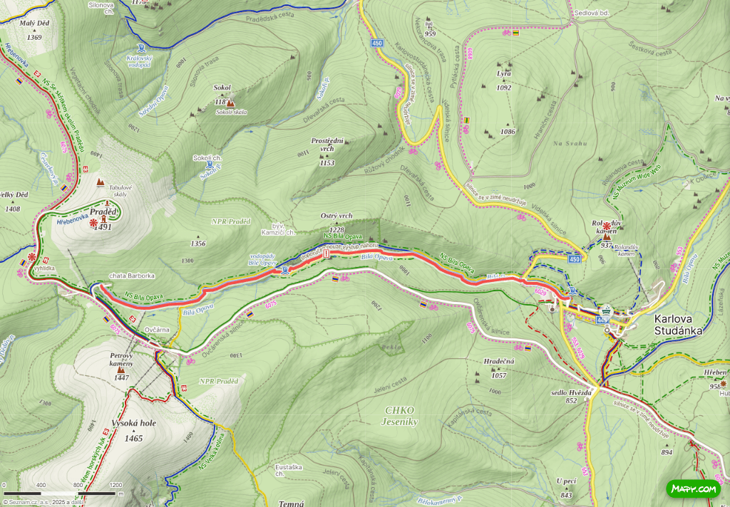 Pěší výšlap na Praděd, pauza (cca 20 minut) a návrat na chatu Barborka (celkem trasa měří 6,5 km). Odpočinek (malý oběd), zdolání NS Bílá Opava s cílem v Karlově Studánce (cca 6 km). Letmá prohlídka Karlovy Studánky a sraz na zastávce Karlova Studánka, dolní parkoviště.